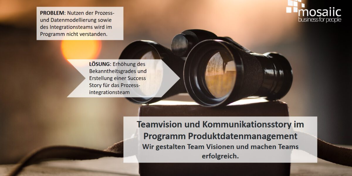 Teamvision und Kommunikationsstory im Programm Produktdatenmanagement Das Querschnittsteam Prozessintegration in einem großen Programm zum Produktdatenmanagement eines deutschen Automobilherstellers hat noch nicht die Durchschlagskraft und Akzeptanz, um ein gesamthaftes End-to-End Prozessmodell zu modellieren und nachhaltig zu verankern. Der Mehrwert für unsere Kunden Commitment zur eigenen Identität des Prozessintegrationsteams Erhöhung des Bekanntheitsgrades und der Akzeptanz des Prozessintegrationsteams Die Herausforderung Das Thema Prozessintegration