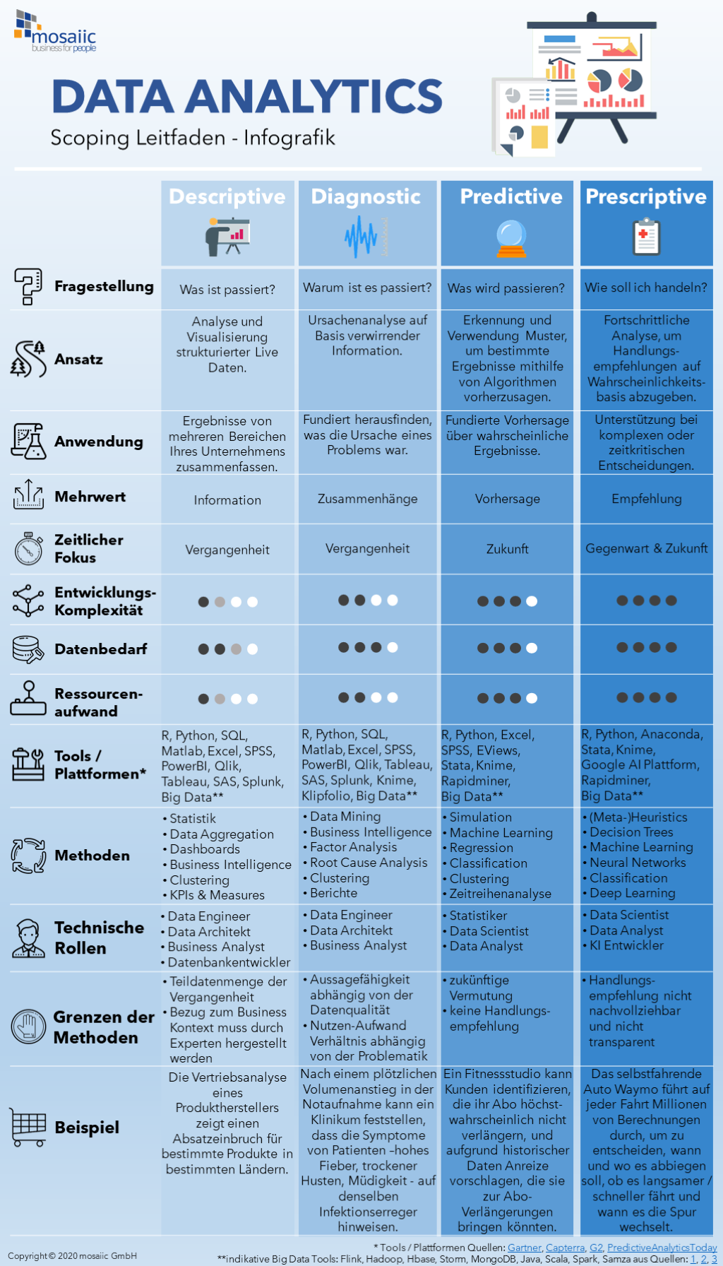 Um unseren Kunden die Orientierung zu erleichtern, hat mosaiic einen Scoping Leitfaden entwickelt, den wir in diesem mosaiic-Impuls als übersichtliche Infografik zur Verfügung stellen. Die vier wichtigsten Data Analytics Ansätze, nämlich Descriptive, Diagnostic, Predictive und Prescriptive Analytics, werden anhand der wesentlichen Kriterien im Vergleich dargestellt. Die Infografik dient Ihnen somit als Hilfsmittel bei der Entscheidung „Welcher Ansatz ist für die Zielerreichung meiner Firma geeignet?“.