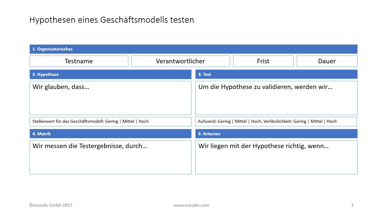 Auf welchen Hypothesen basiert Ihre Geschäftsmodell-Innovation? Und wie wollen Sie diese testen? Kontaktieren Sie uns für uns gerne für weitere Fragen!