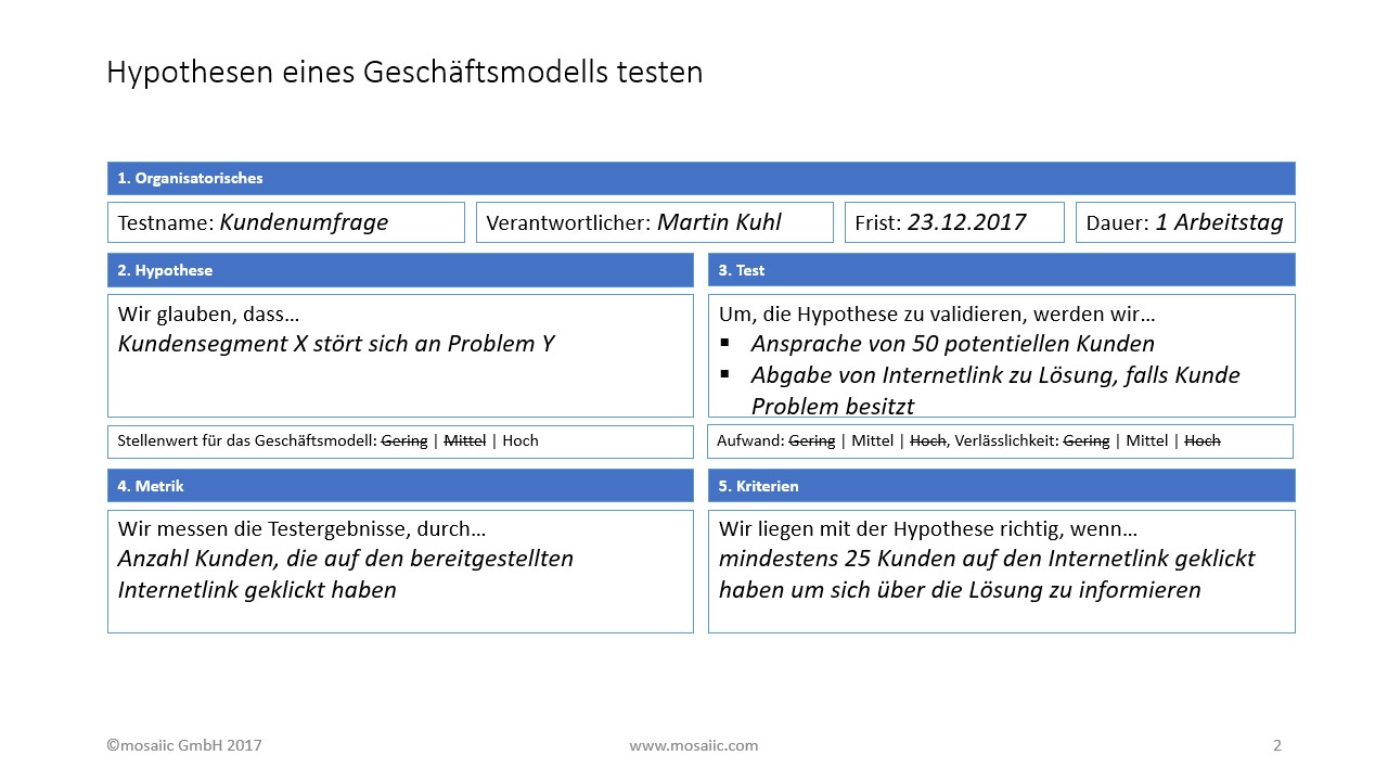 • einer zu validierenden Hypothese sowie ihre Relevanz für das Geschäftsmodells (gering, mittel, hoch),