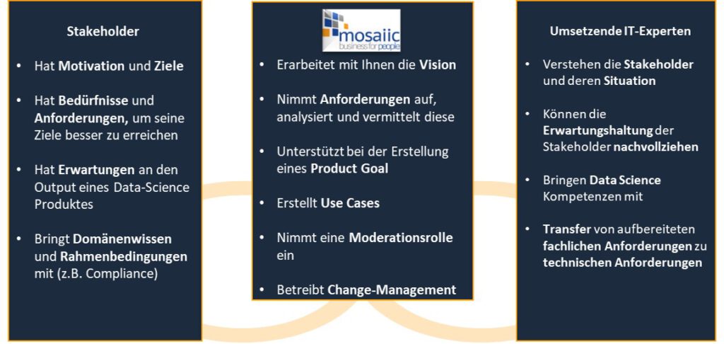 Die mosaiic unterstützt Sie gerne in Ihren Wunsch die Digitalisierung in Ihrem Unternehmen voranzutreiben. In Data Science Projekten nehmen wir eine Analyse- und Vermittlungsrolle ein. Als menschliche Schnittstelle besitzen wir sowohl ein Verständnis für die technischen Möglichkeiten als auch das fachliche Know-how für die Prozesse und Herausforderungen Ihres Unternehmens. Dies erlaubt es uns, die Kommunikation zwischen allen am Projekt beteiligten Parteien qualitativ zu fördern und dementsprechend das Projekt proaktiv zu begleiten.