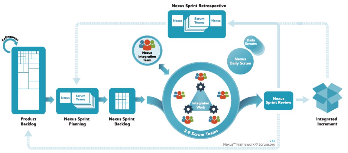 Das Nexus™ Framework ist ein Prozess-Rahmenwerk für 2-9 Scrum Teams, die gemeinsam ein integriertes Produkt bzw. eine integrierte Software erzeugen. Die Hauptziele bestehen in